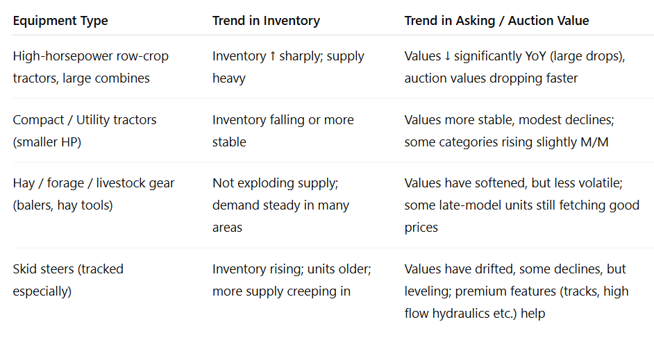 The divide comes down to profitability. Row crop farmers are facing low returns, so they are pulling back on capital spending. Livestock producers, on the other hand, have been selling cattle into strong markets and need dependable equipment to keep up with haying and feeding. That difference in demand is keeping utility tractors, hay tools, and versatile equipment like skid steers in better shape than the machines built for large-scale grain farming.